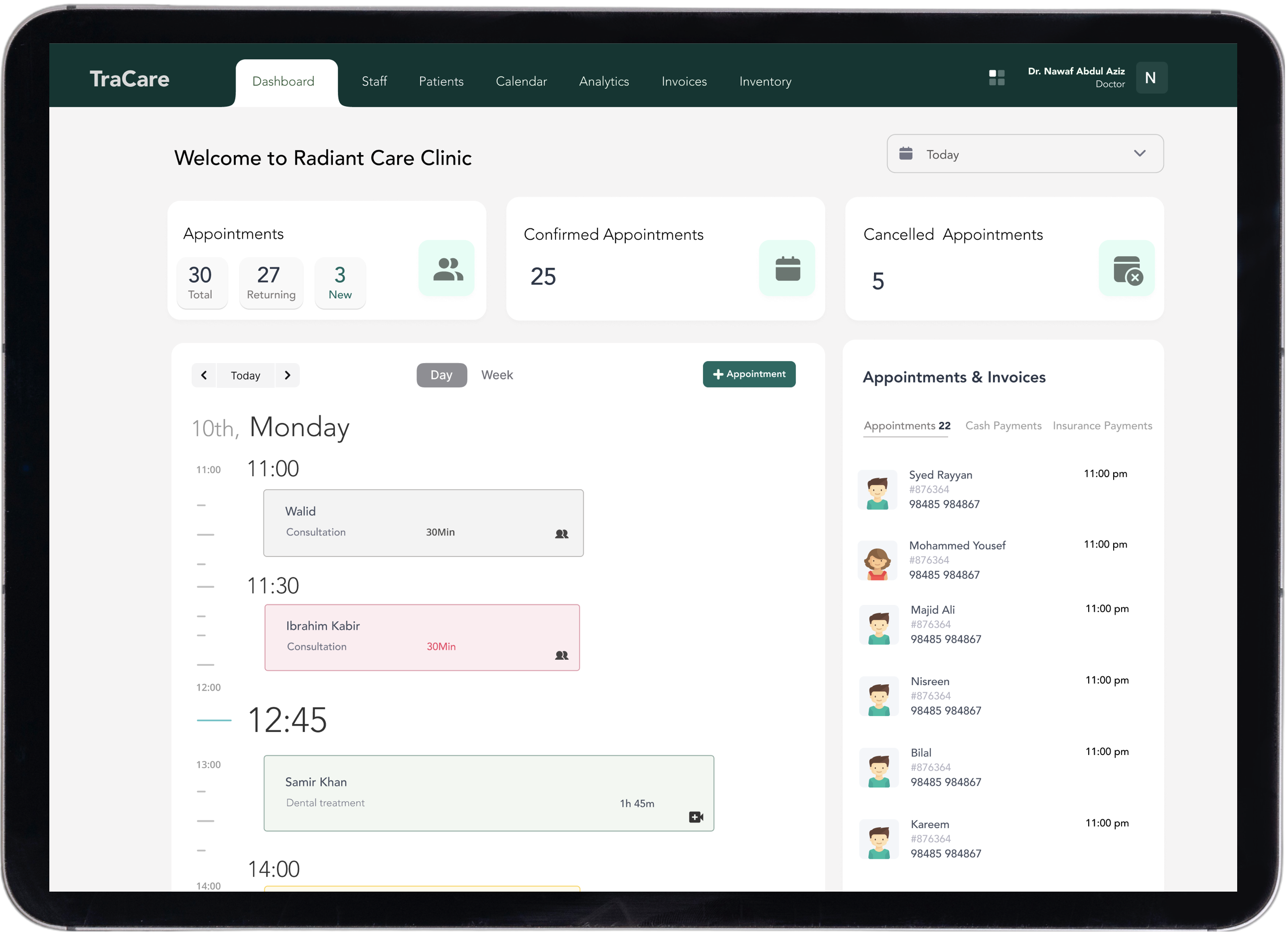 TraCare هو نظام معلومات صحي (HIS) متكامل قائم على السحابة من الجيل الجديد، تم تصميمه خصيصًا للعيادات والمجمعات الطبية. يدمج وظائف رئيسية مثل التقويم الذكي،تتبع مؤشرات الأداء الرئيسية المتقدمة، إدارة المخزون، مما يوفر سير عمل سلس لمقدمي الرعاية الصحية.
